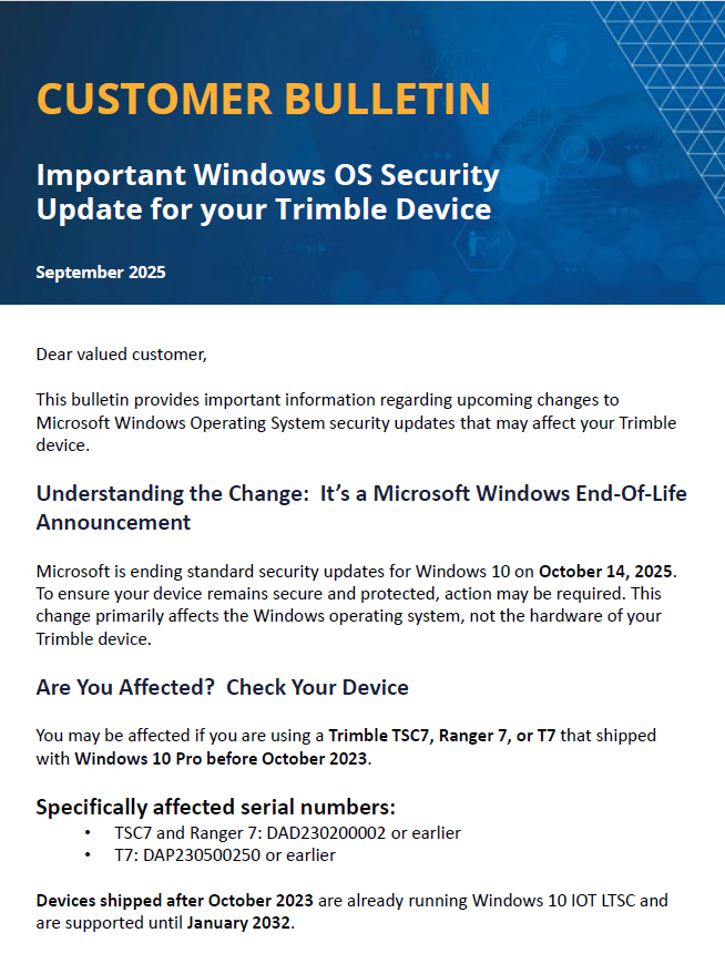 Attention Trimble TSC7, Ranger 7, and T7 users! Microsoft is discontinuing standard security updates for Windows 10 on October 14, 2025. This crucial change impacts the ongoing security and protection of your Trimble devices. To ensure your device remains secure, immediate action may be required.